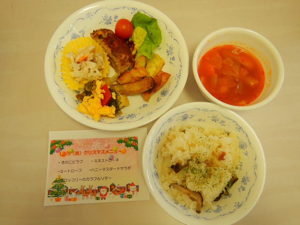 給食の時間、美味しそう!クリスマスのごちそうだ!と歓声があがります。素敵なクリスマスカードのお品書きもあります。給食さんありがとうございます