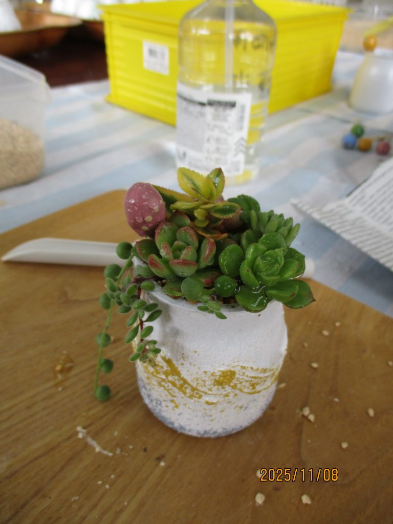 ワークショップではこんなにかわいい多肉植物を作りました♪もう一つは革のキーホルダーです