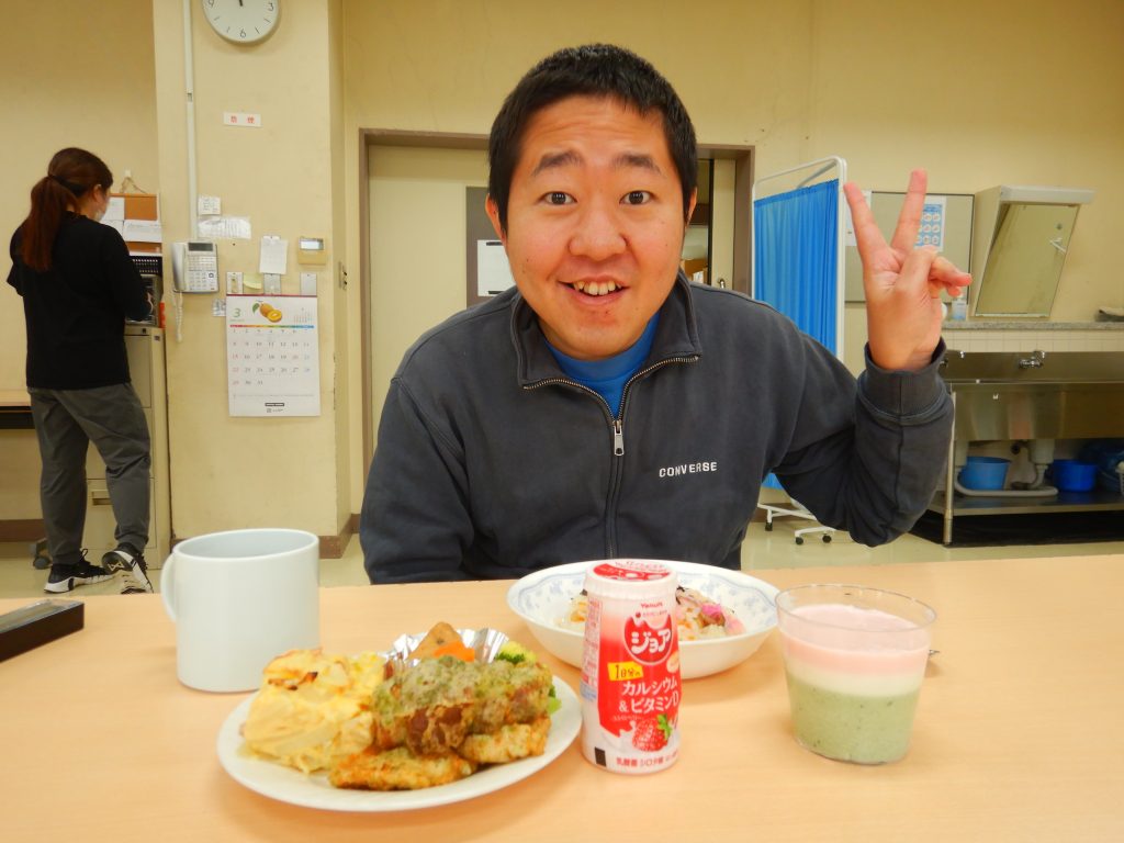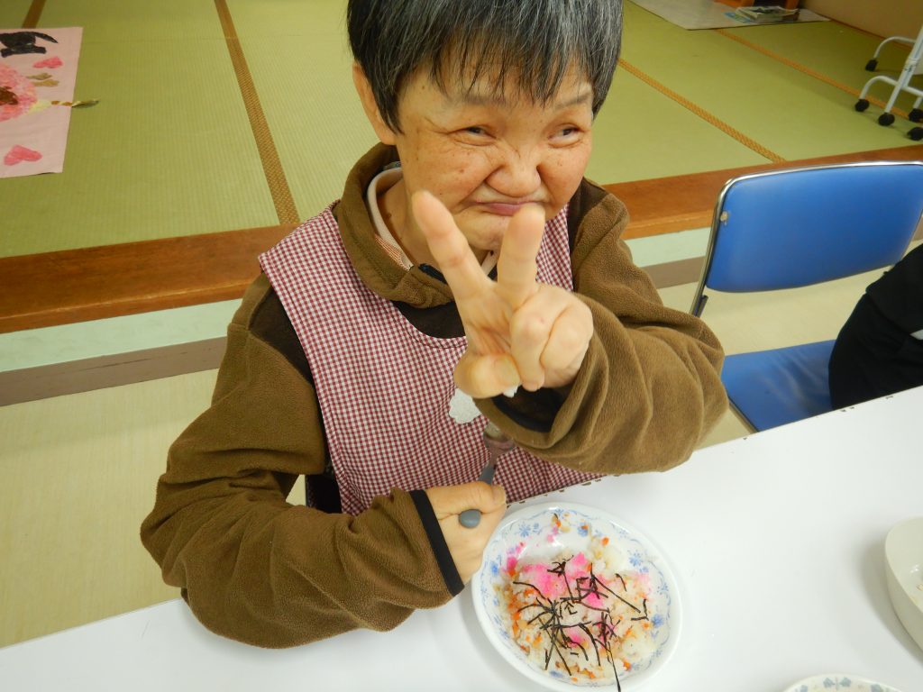 笑顔いっぱいです!デザートは、ひしもちをイメージしたひな祭りゼリーです。このゼリーは、一段目イチゴミルク、二段目ミルク、三段目抹茶味。とっても美味しい、美しい手がこんでいるゼリーでした。