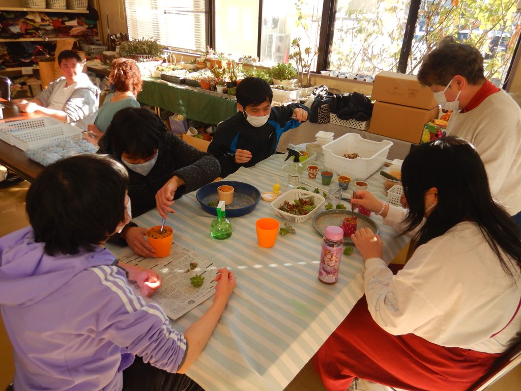 多肉植物をボランティアの方に教えて頂きながら寄せ植えを作ります。