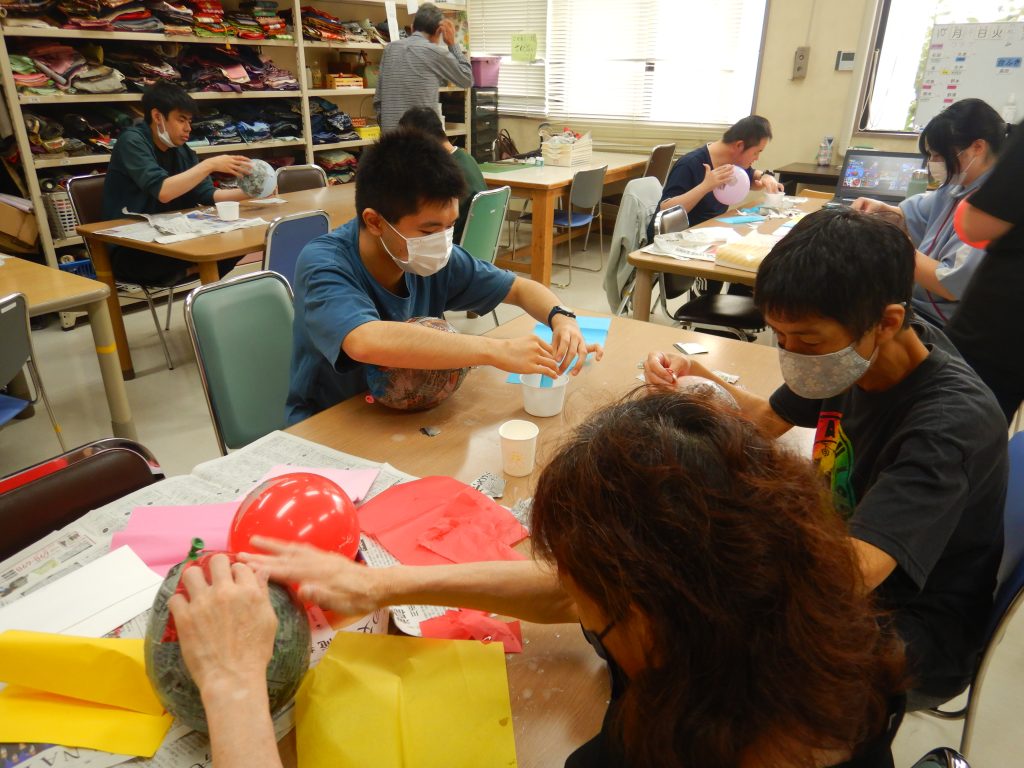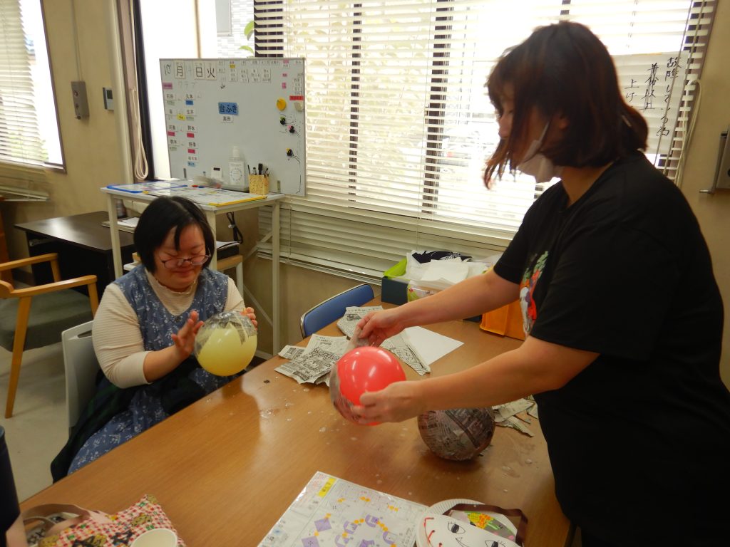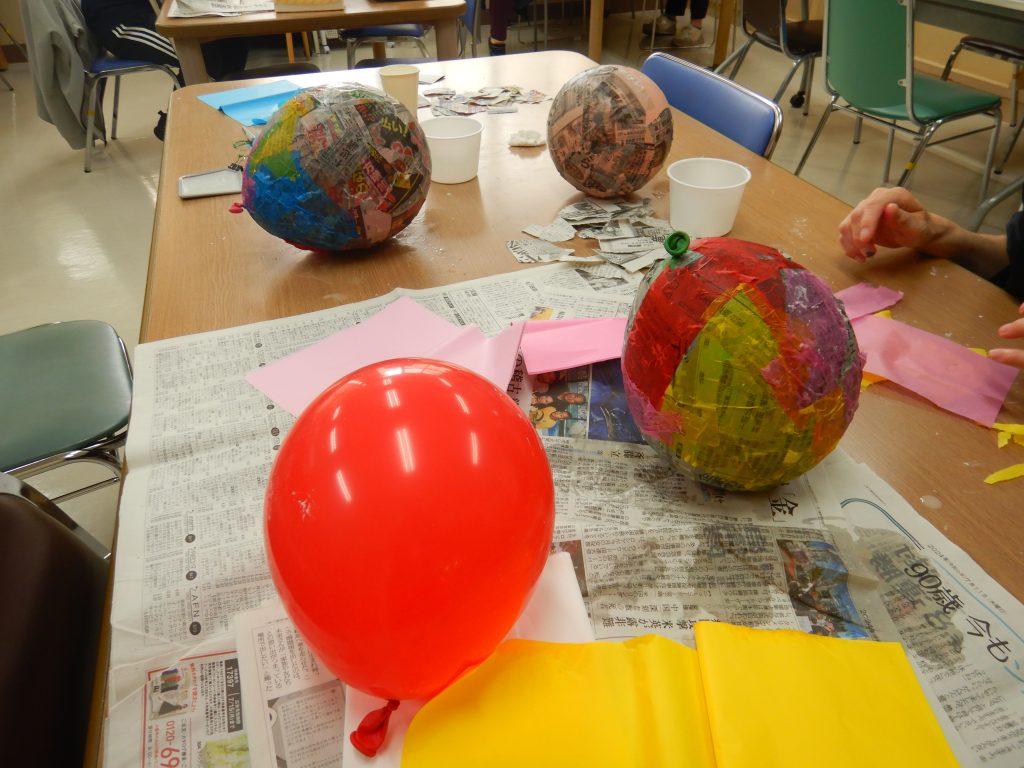 ふくらました風船に新聞やお花紙を貼って仕上げていきます!
