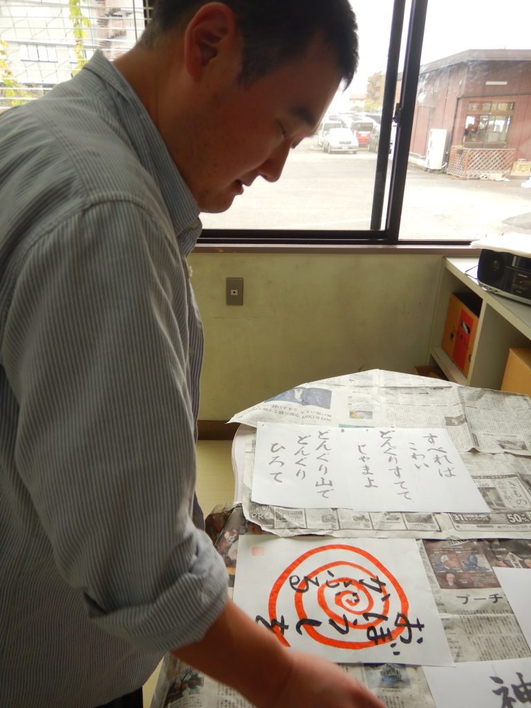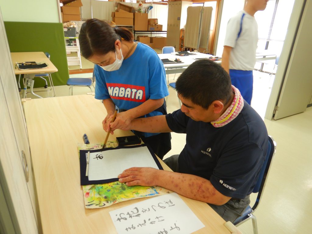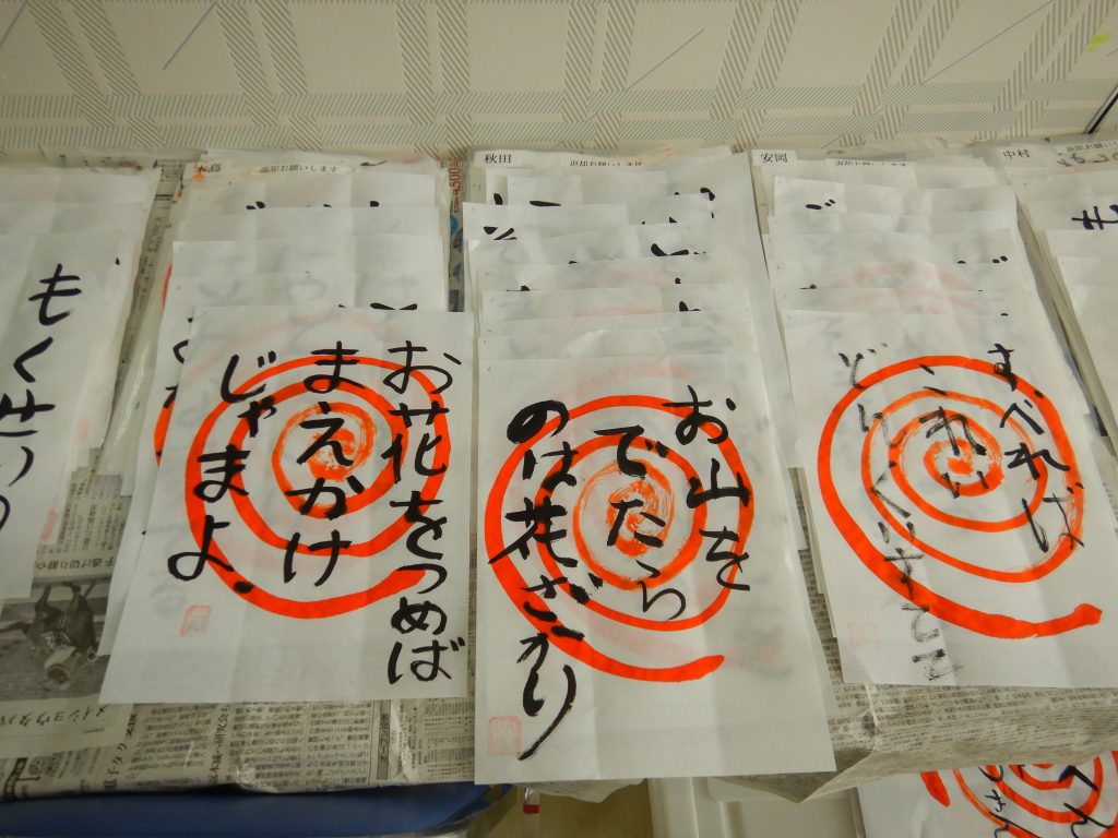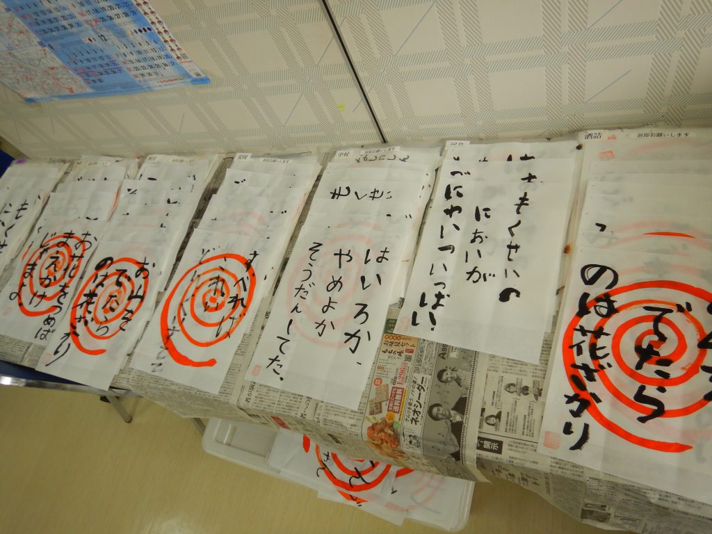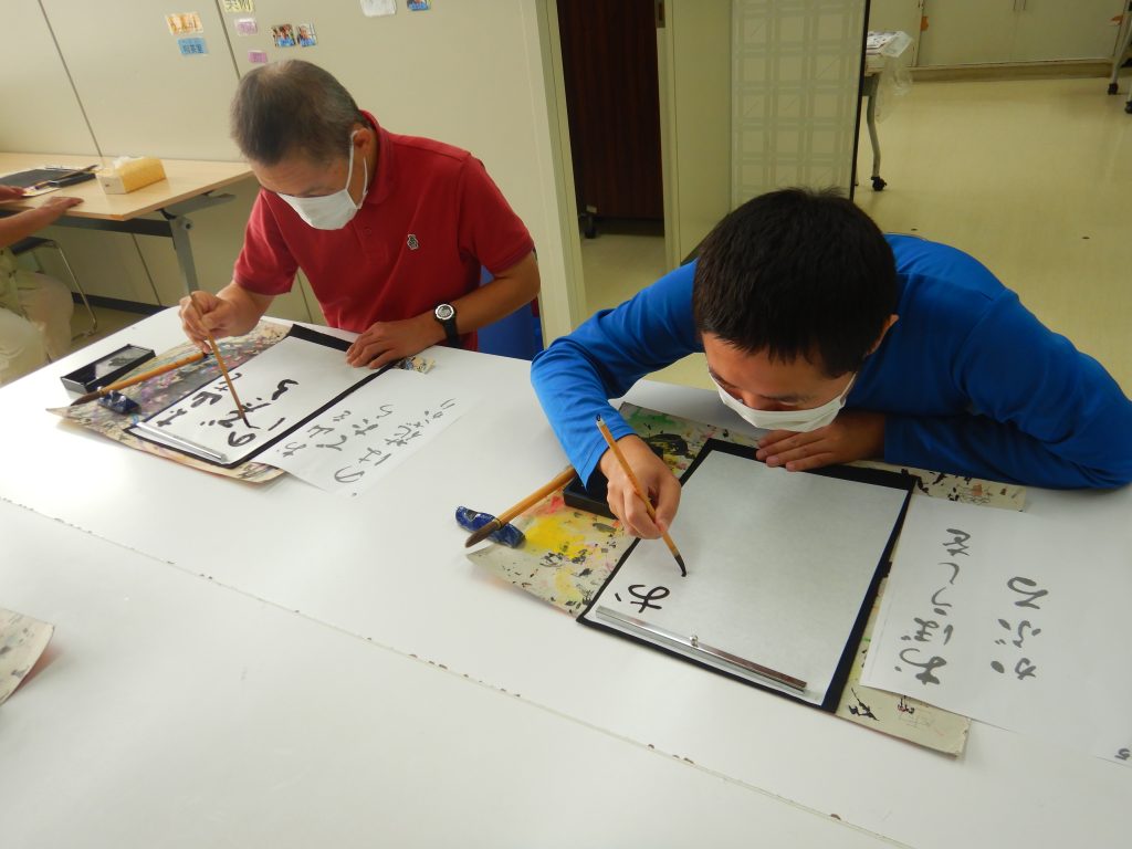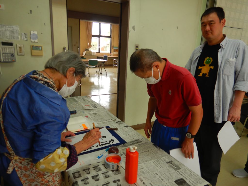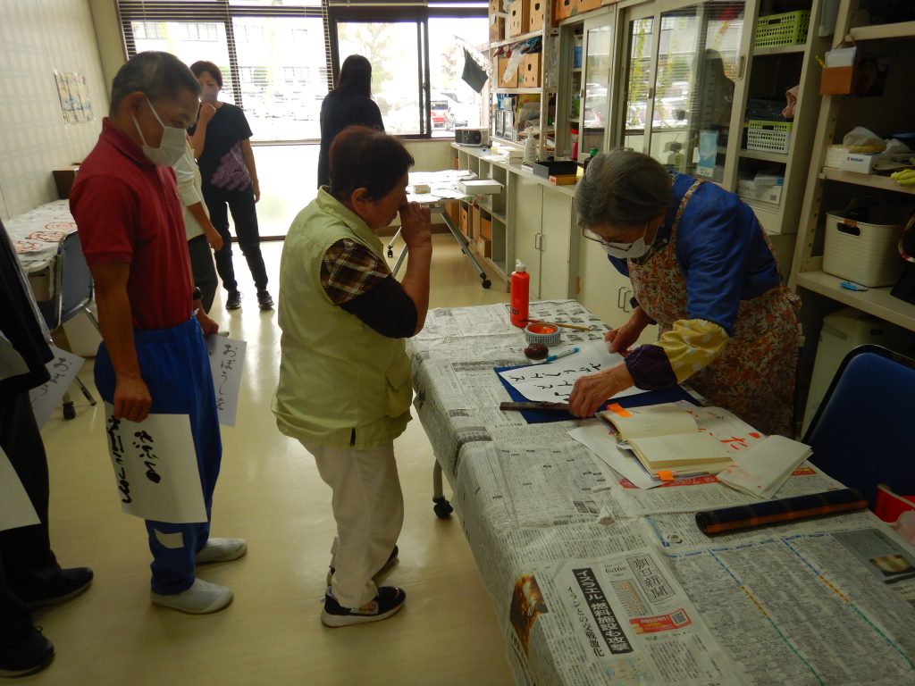 美術クラブは、書道を行いました。皆さん先生に見ていただいています。