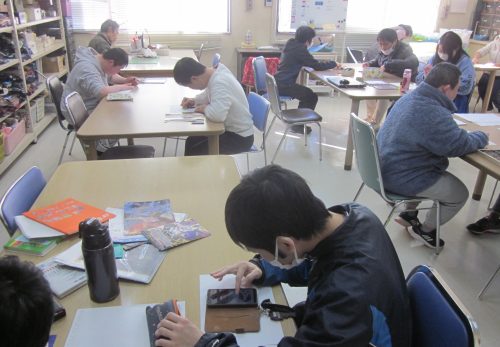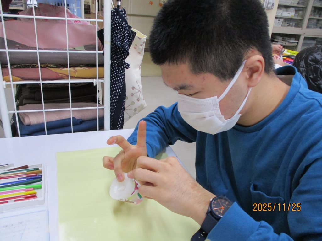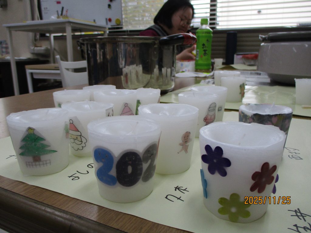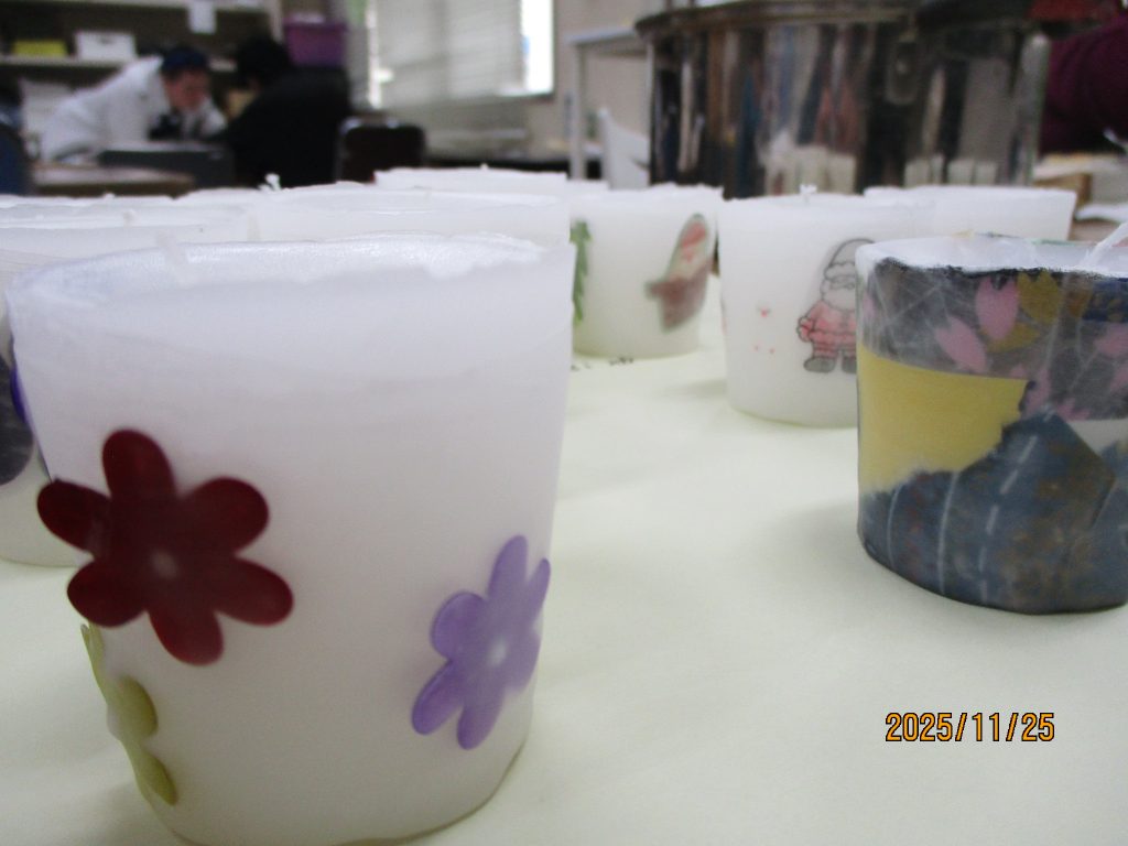 創作クラブは前回の続きのロウソク作りに挑戦しました。自分のロウソクに色を塗ったモチーフや和紙を貼り合わせて、コーティングします。