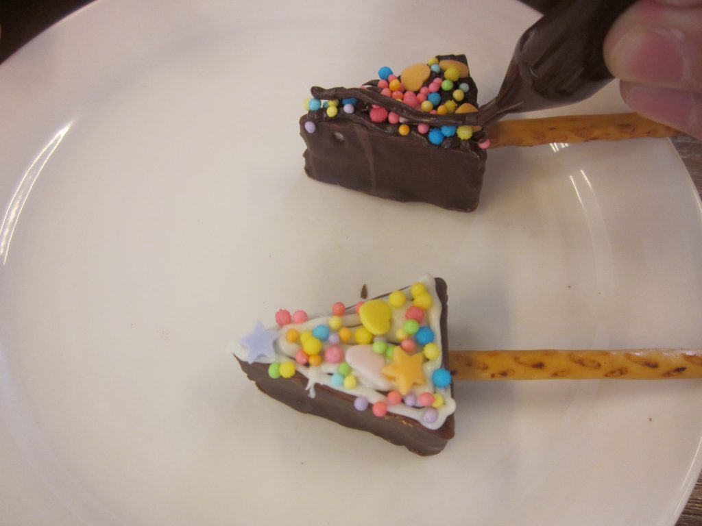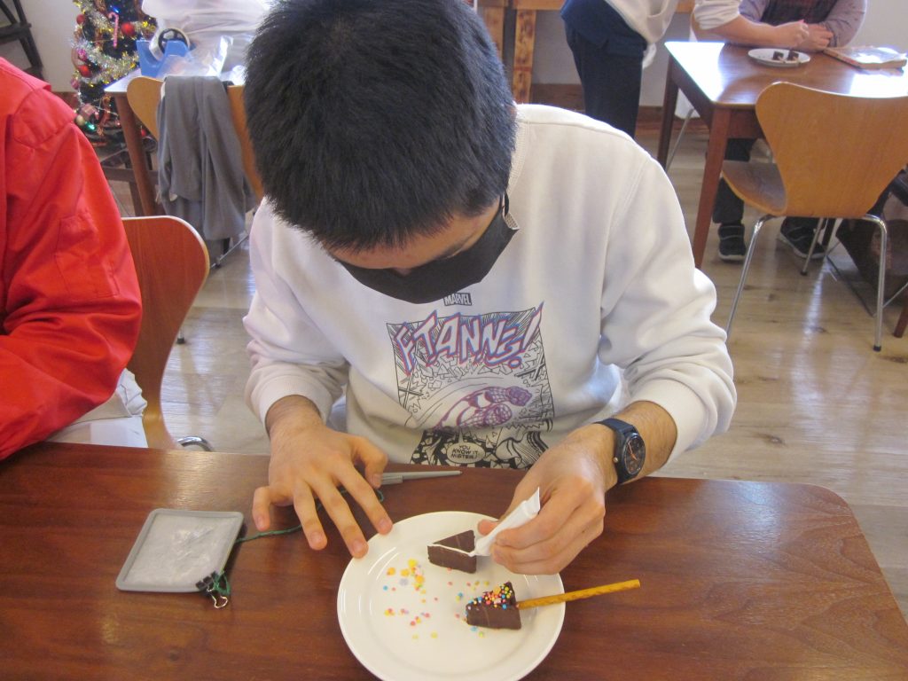 創作クラブはクリスマス会でした。みんなでクリスマスツリーのプチケーキ作りから始まりました。