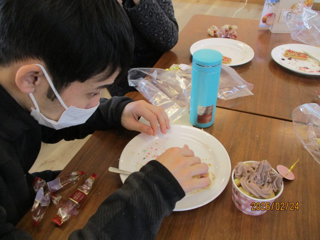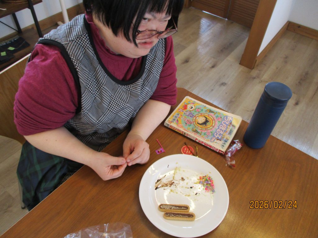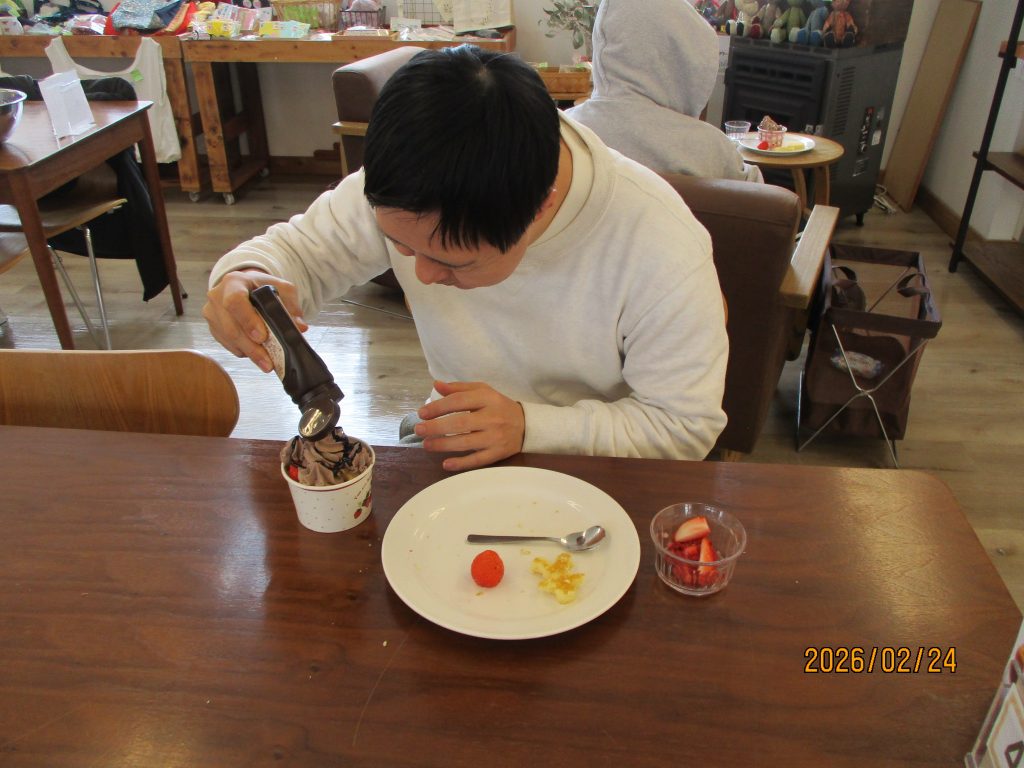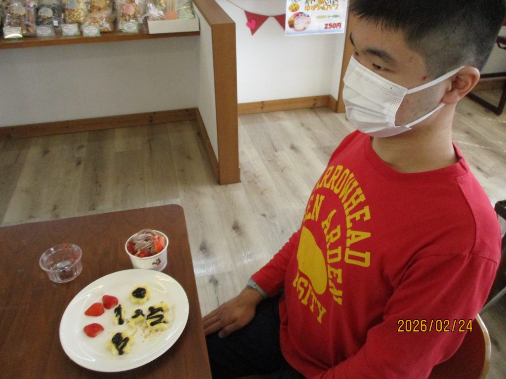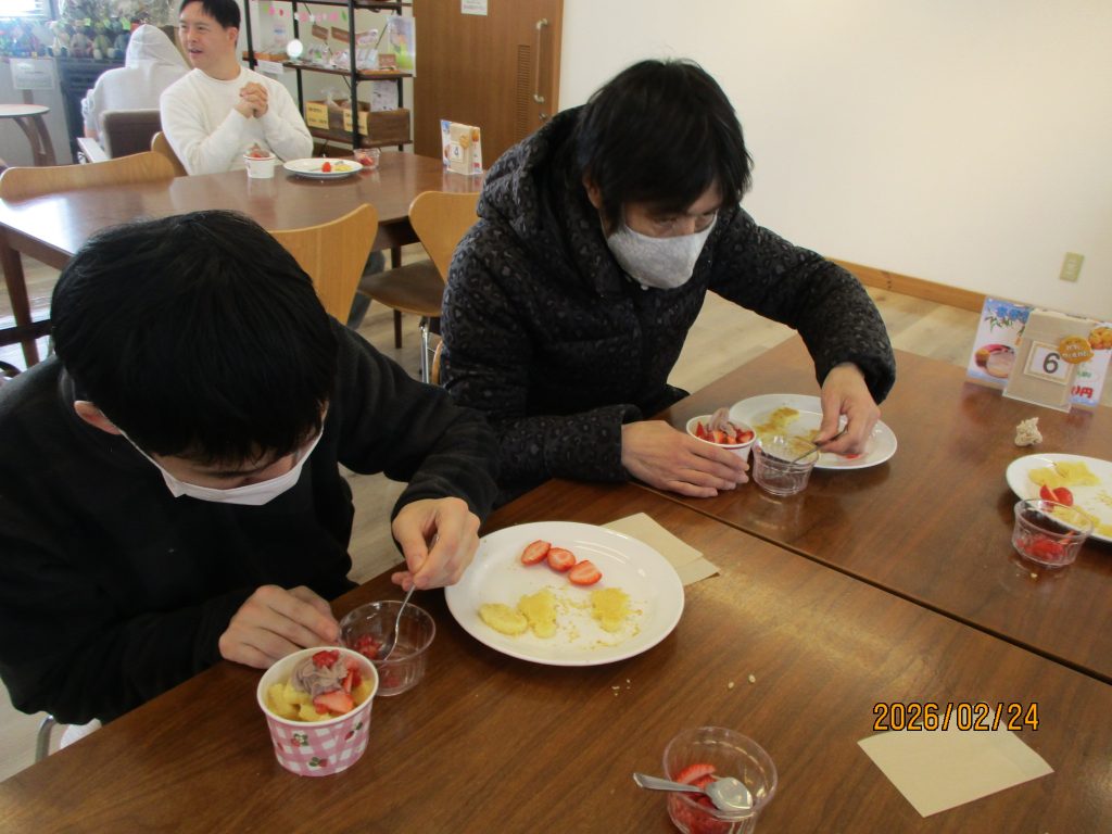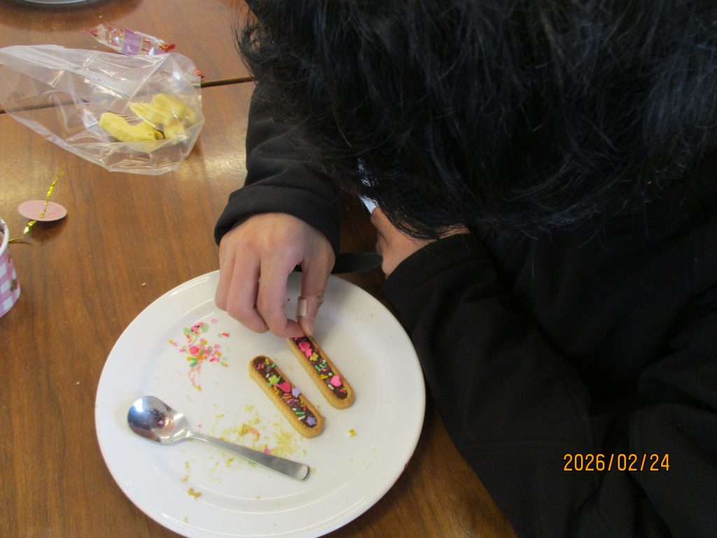 創作クラブはバレンタインチョコ作りに挑戦!!スポンジケーキを色々な型にとり果物や可愛いチョコレートでデコレーションしました。